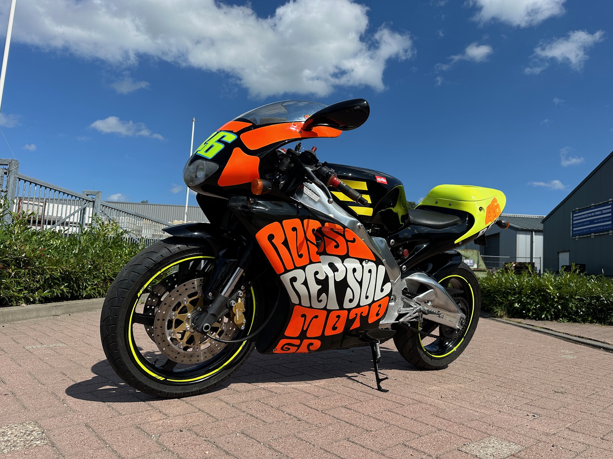 The custom paintwork, inspired by Valentino Rossi’s 2003 race bike, is fully sprayed on (no stickers), giving this RS250 a truly one-of-a-kind look.