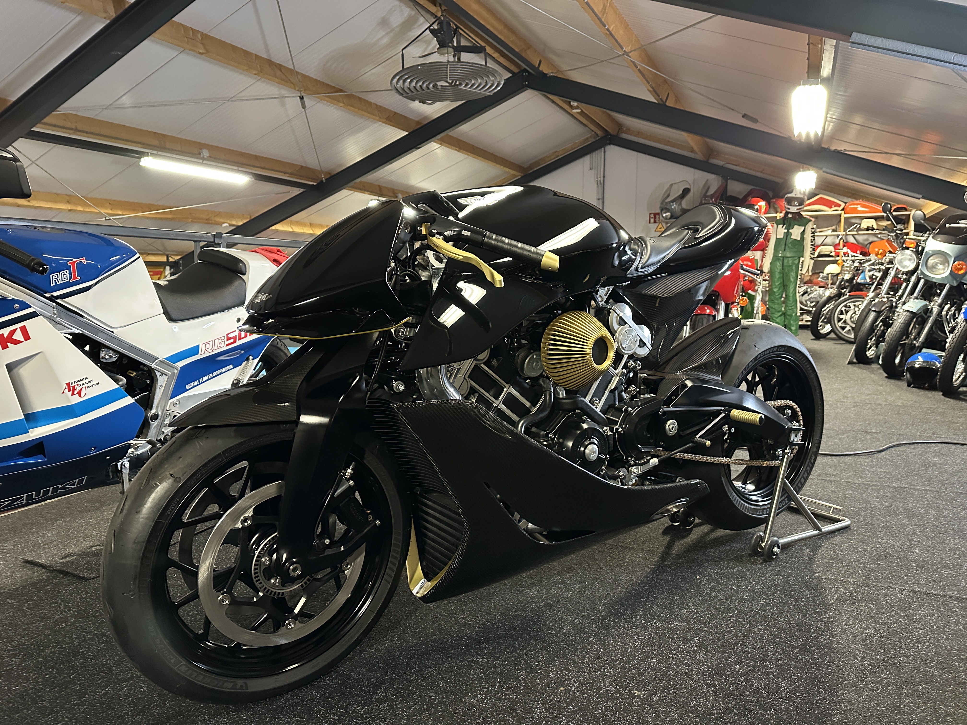 Dieses Motorrad mit seinem Carbonfaserrahmen und dem für Aston Martin typischen Luxusdesign ist eine perfekte Verschmelzung von Spitzentechnologie und zeitloser Automobilästhetik.