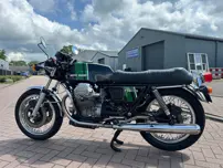 Die Moto Guzzi 750 S3 von 1976 ist ein Beweis für italienische Motorradbaukunst und bekannt für ihr unverwechselbares Design und ihre zuverlässige Leistung. Dieses Modell verfügt über einen 748-cm3-V-Twin-Motor, der bei 6.900 U/min etwa 62 PS liefert und Geschwindigkeiten von bis zu 206 km/h (128 mph) erreichen kann.