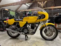 De Norton 750 vertegenwoordigt het beste van de Britse motorsport uit het begin van de jaren 70 en biedt zowel stijl als prestaties.