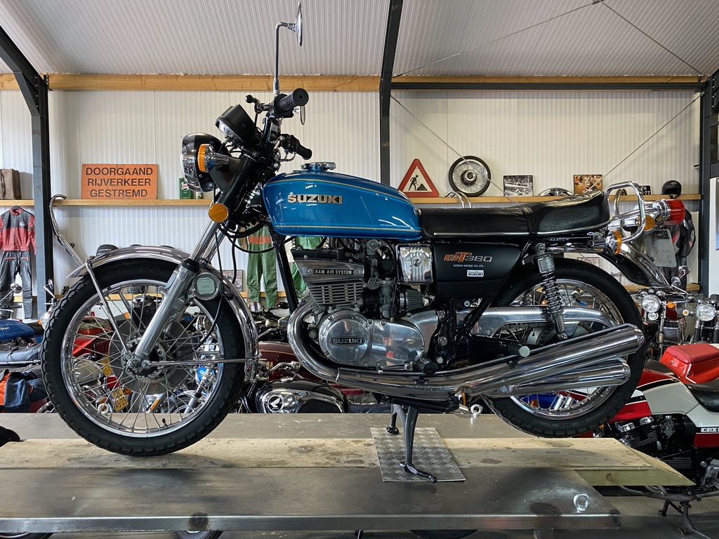 Uitgevoerd in de prachtige originele blauwe kleur, met chromen details en Suzuki's kenmerkende GT-serie-ontwerp.